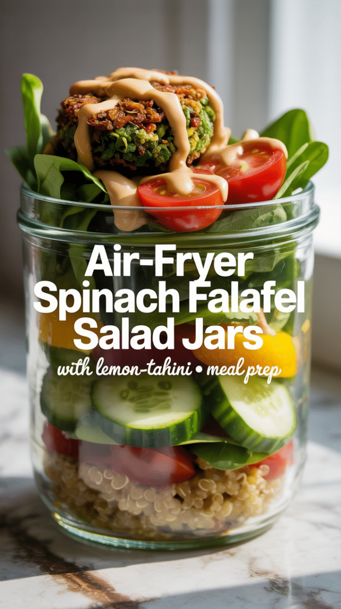 Meet your new favorite meal-prep lunch: air-fried spinach falafel, fluffy quinoa, crunchy cucumbers and tomatoes, and a zesty lemon–tahini drizzle layered in portable salad jars. It’s bright, satisfying, and loaded with plant protein and fiber—perfect for busy weekdays.